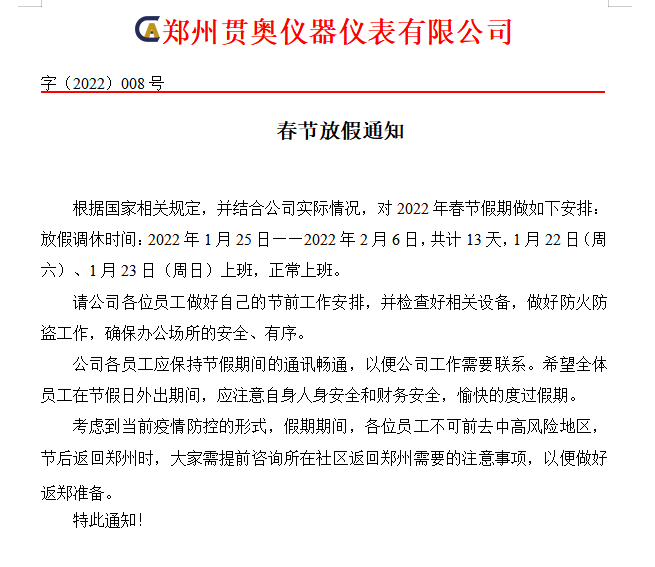 在此,感謝大家在過去一年里對鄭州貫奧儀器儀表的支持與信任。同時(shí)也希望在新的一年里,鄭州貫奧儀器儀表能繼續(xù)得到大家的關(guān)注及支持,并且鄭州貫奧儀器儀表也會一如既往地為大家提供更優(yōu)質(zhì)的服務(wù)!
