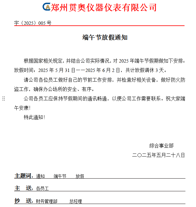 【鄭州貫奧儀器儀表有限公司】2025端午節放假通知 ! ????