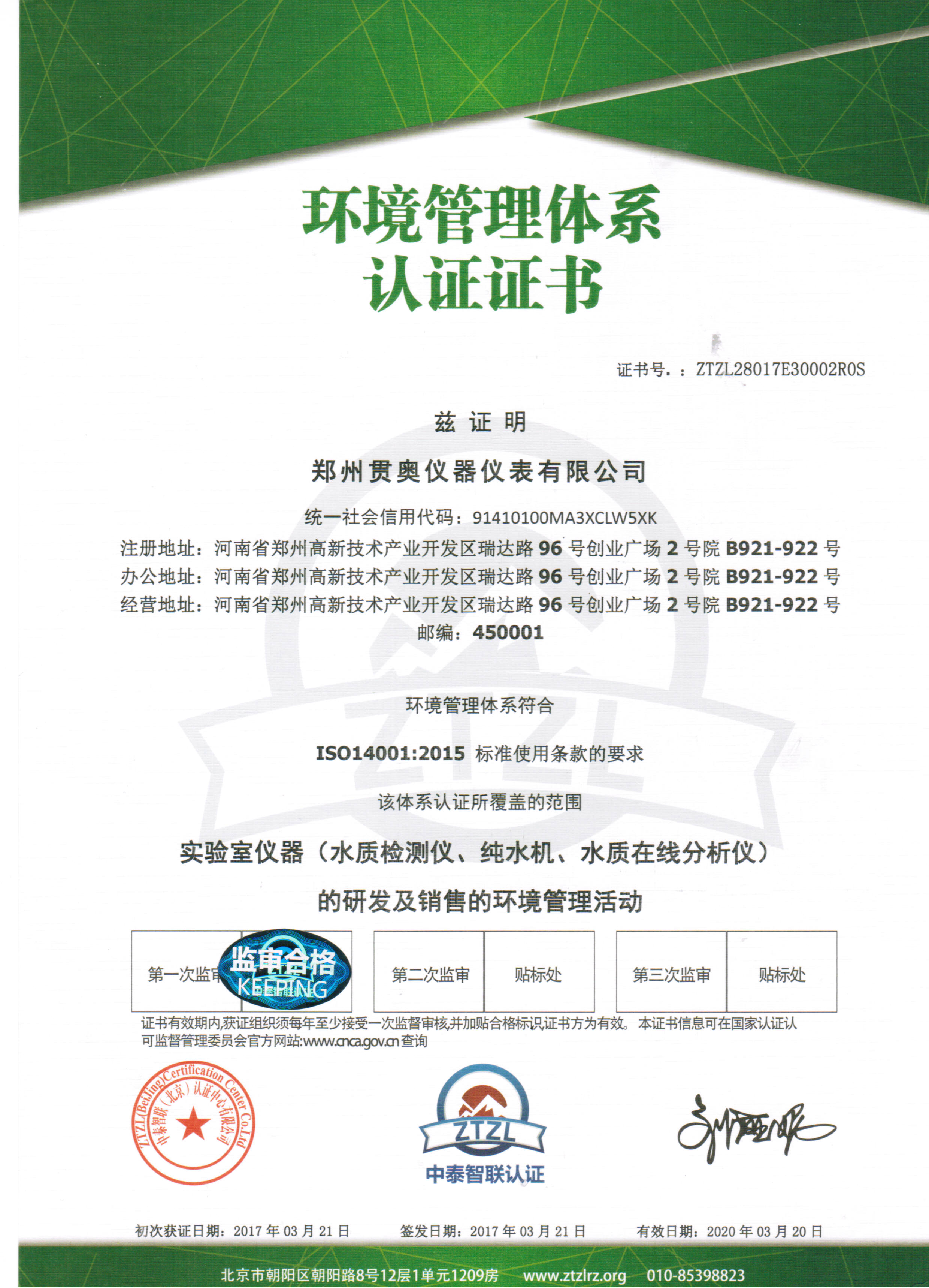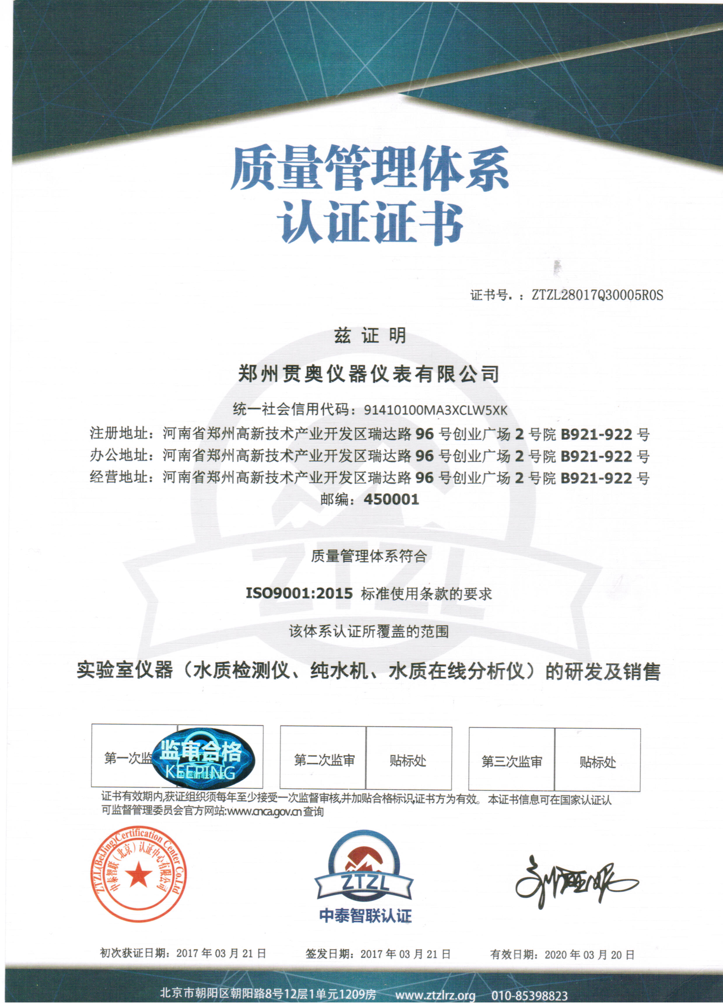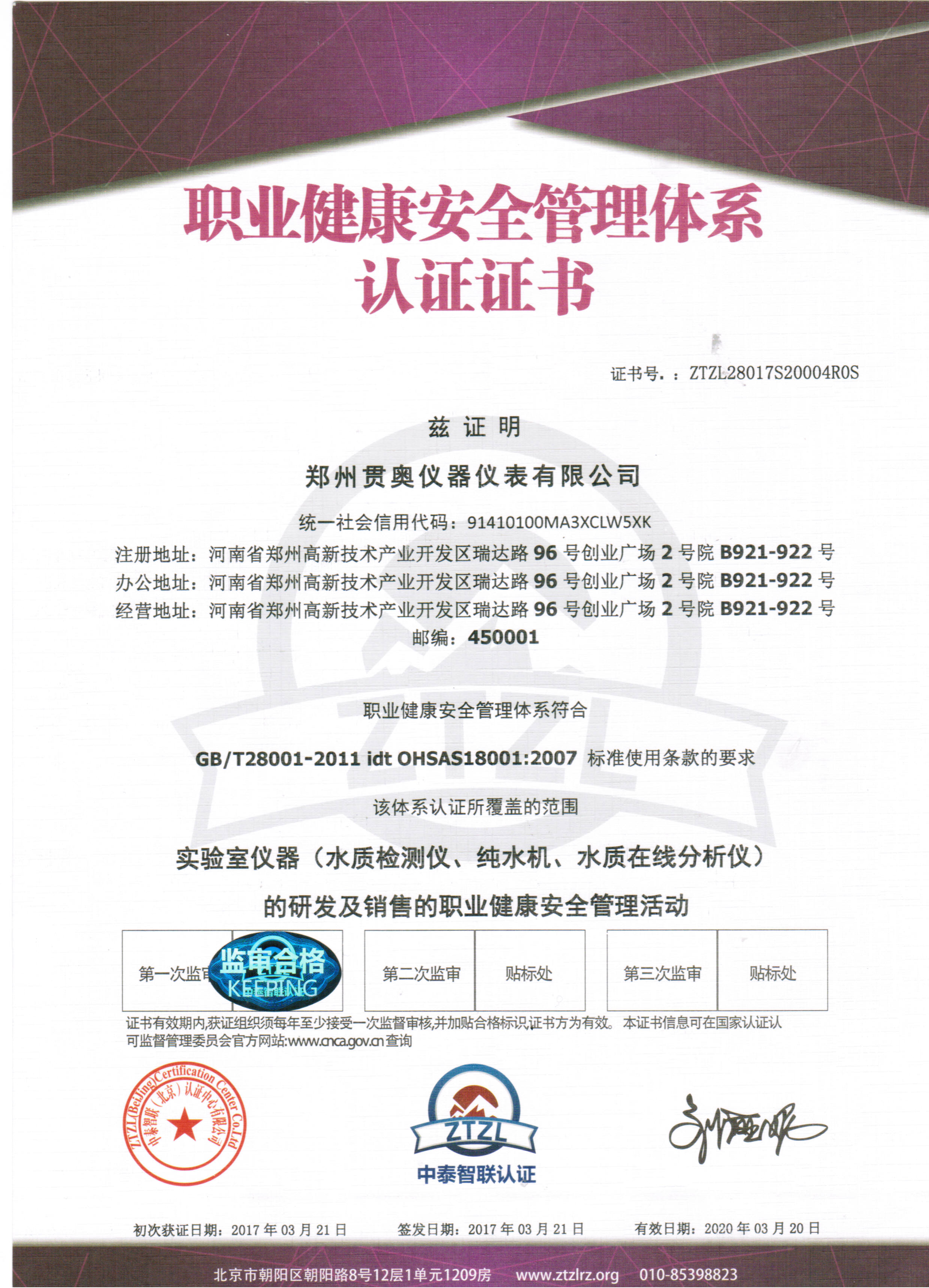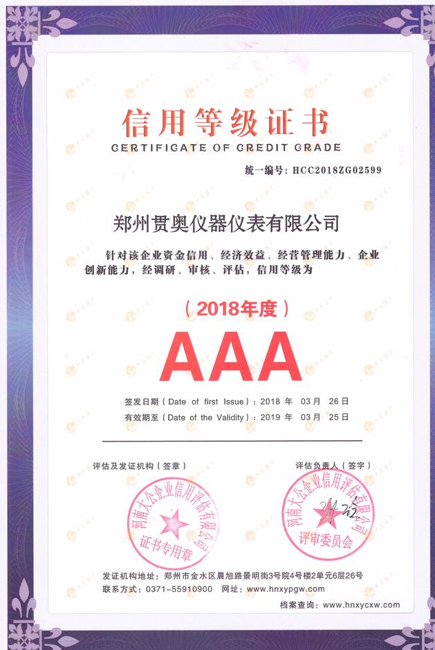 鄭州貫奧儀器儀表有限公司的所有設備均經過省級計量院認證和檢驗,貫奧其儀器儀表非常重視知識產權的研發和保護。公司獲得了"ISO9001:2015"質量管理體系認證證書,ISO14001:2015環境管理體系認證證書,OHSAS18001:2007職業健康安全管理體系認證證書。鄭州貫奧儀器儀表有限公司企業信用等級評級"AAA"。